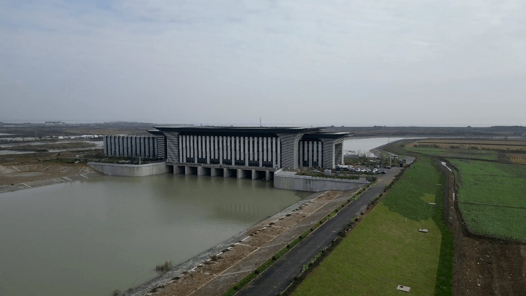 該工程位于肥西縣嚴店鎮(zhèn)蓮花村的派河口泵站,整體新中式造型,鋼琴鍵的外形,中國古建筑飛檐造型,具有騰飛之勢,同時建筑細節(jié)吸取音樂符號以及結(jié)合水紋波動的立面肌理,宛如跳動的樂章。